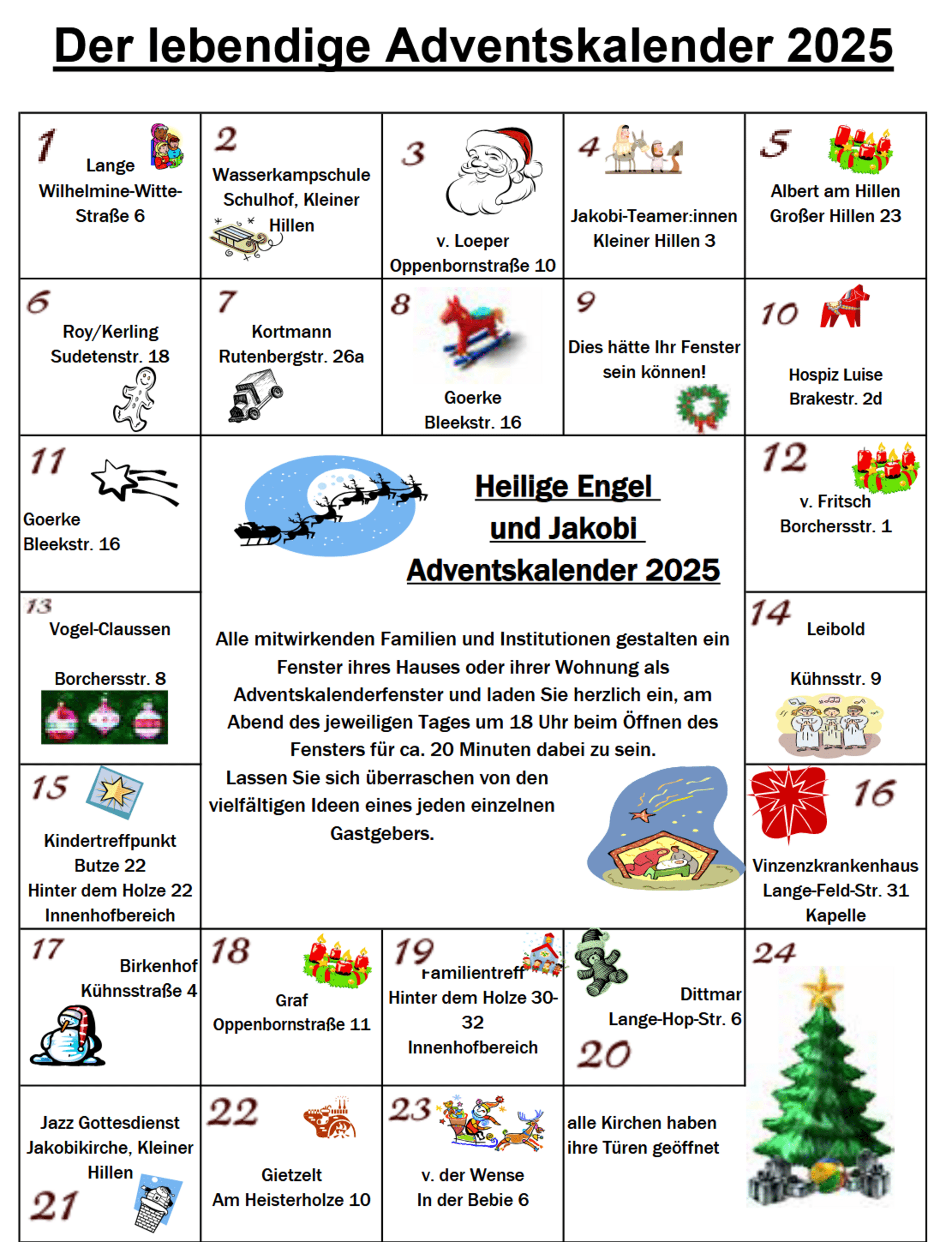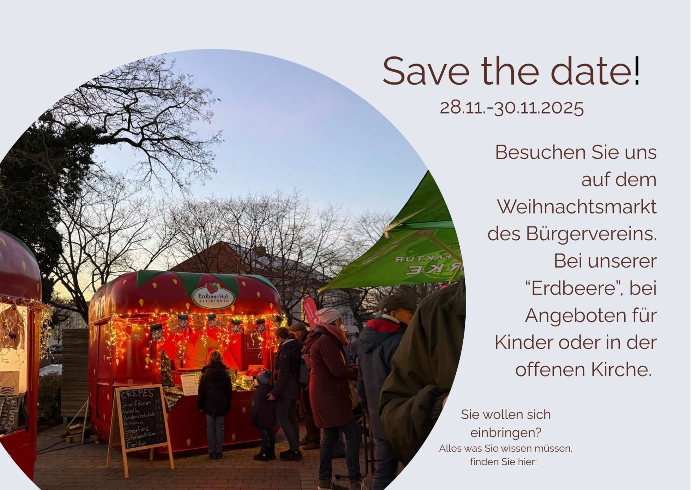 In diesem Jahr ist auch die Jakobigemeinde auf dem Weihnachtsmarkt des Bürgervereins vertreten. Zum einen mit unterschiedlichen Angeboten in einer Erdbeere, zum anderen mit Kinderschminken am Samstag von 15:00 Uhr – 17:00 Uhr und Basteln mit Kindern am Sonntag 14:00- 16:00 Uhr.