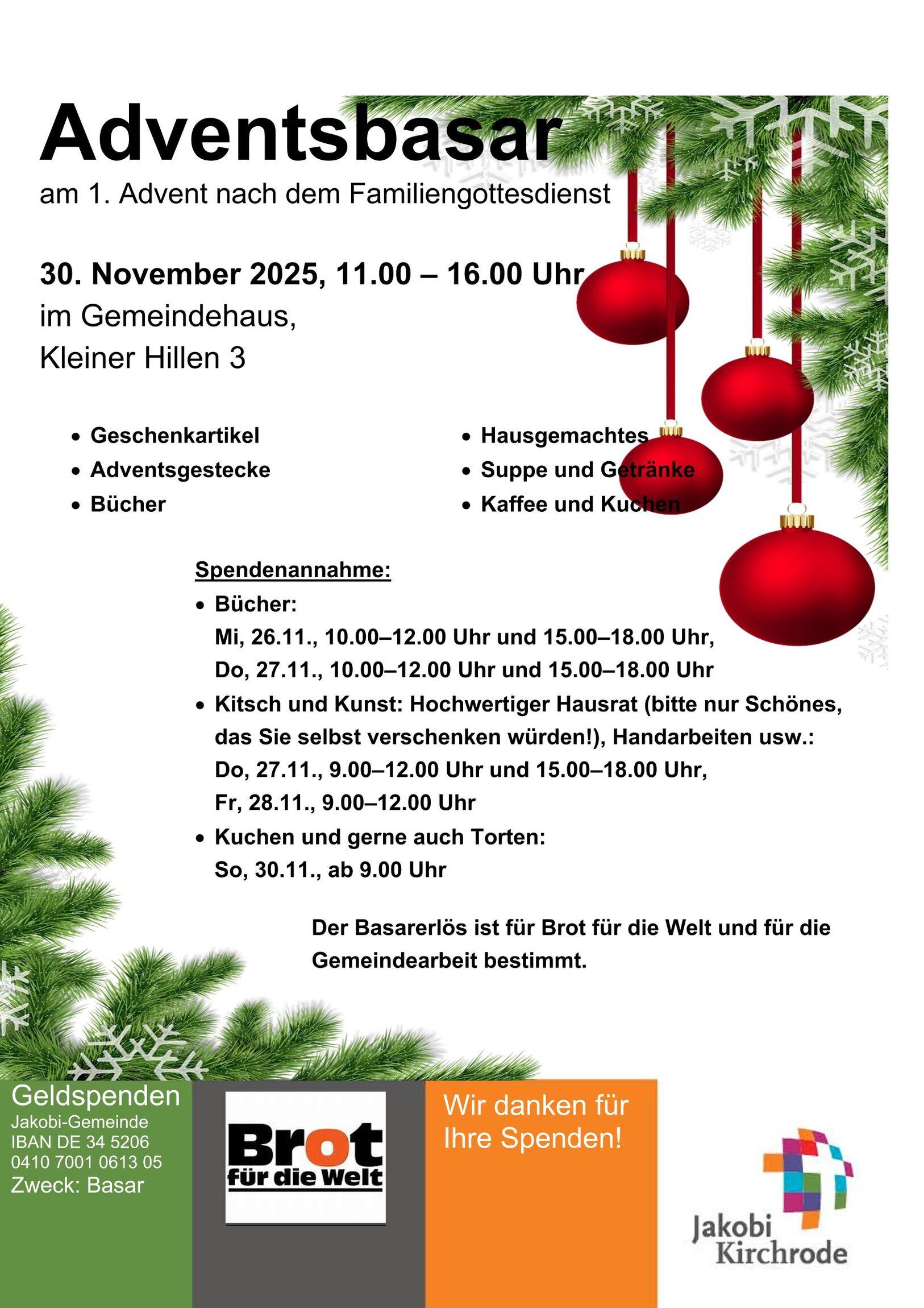 Auch in diesem Jahr findet wieder der Adventsbasar im Jakobi Gemeindehaus statt. Mit vielen Angeboten zum Schauen, Staunen, Kaufen, Essen, Trinken und Klönen. Kommen Sie also gerne vorbei!