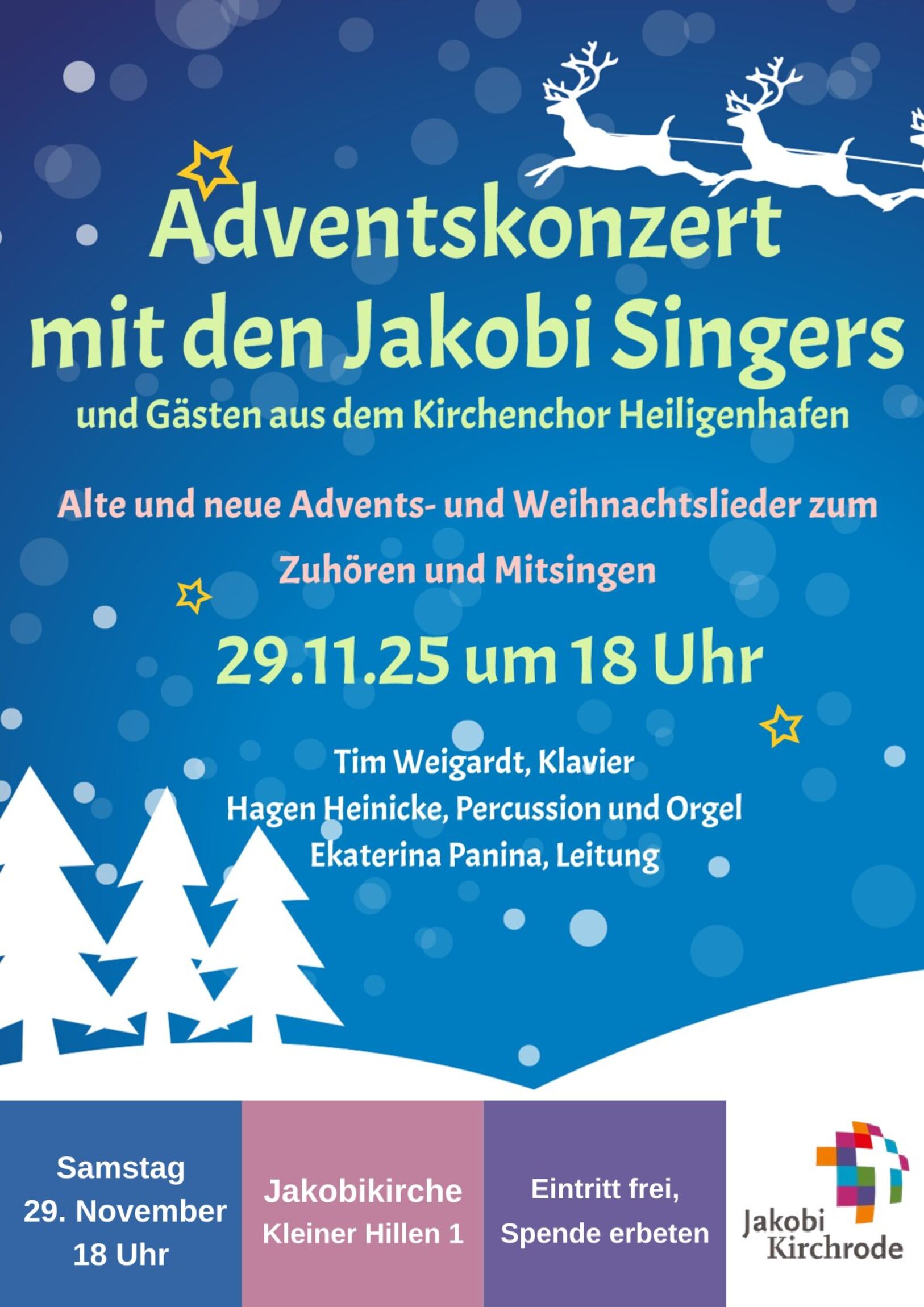 Am Samstag, 29.12.2025, findet um 18 Uhr das diesjährige Adventskonzert mit den Jakobi Singers statt. Im Repertoire sind alte und neue Weihnachtslieder, die mit Gästen aus dem Kirchenchor Heiligenhafen zum Leben erweckt werden.
