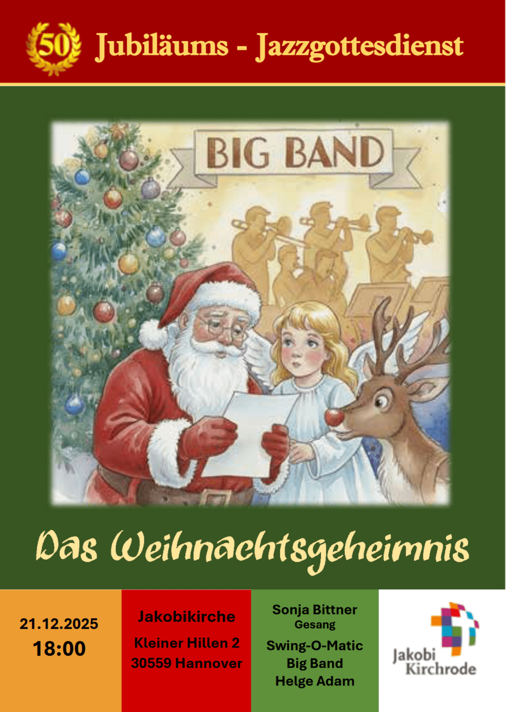 Im kommenden Jazzgottesdienst wird es weihnachtlich – und spannend! Wir sind einem Geheimnis auf der Spur. Wird es sich ergründen lassen? Wir werden sehen. Wichtige Figuren der Weihnachtszeit sind als Zeugen geladen. Zur Unterstützung haben wir eine ausgewachsene Bigband an Bord: Swing-O-Matic mit ihrem Bandleader Helge Adam und mit der Sängerin Sonja Bittner. Jazzfans kennen die Musiker bereits aus früheren Jazzgottesdiensten und Konzerten in Jakobi. Viel Musik also, jazzige Weihnachtslieder satt! Und das hat einen besonderen Grund: Wir feiern den 50. Jazzgottesdienst in Jakobi!
